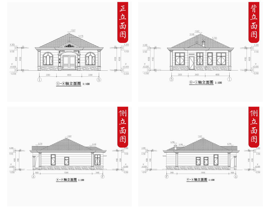 建筑立面圖:東立面圖,西立面圖,南立面圖,北立面圖,剖面圖;
