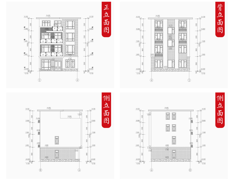 建筑立面圖:東立面圖,西立面圖,南立面圖,北立面圖,剖面圖;